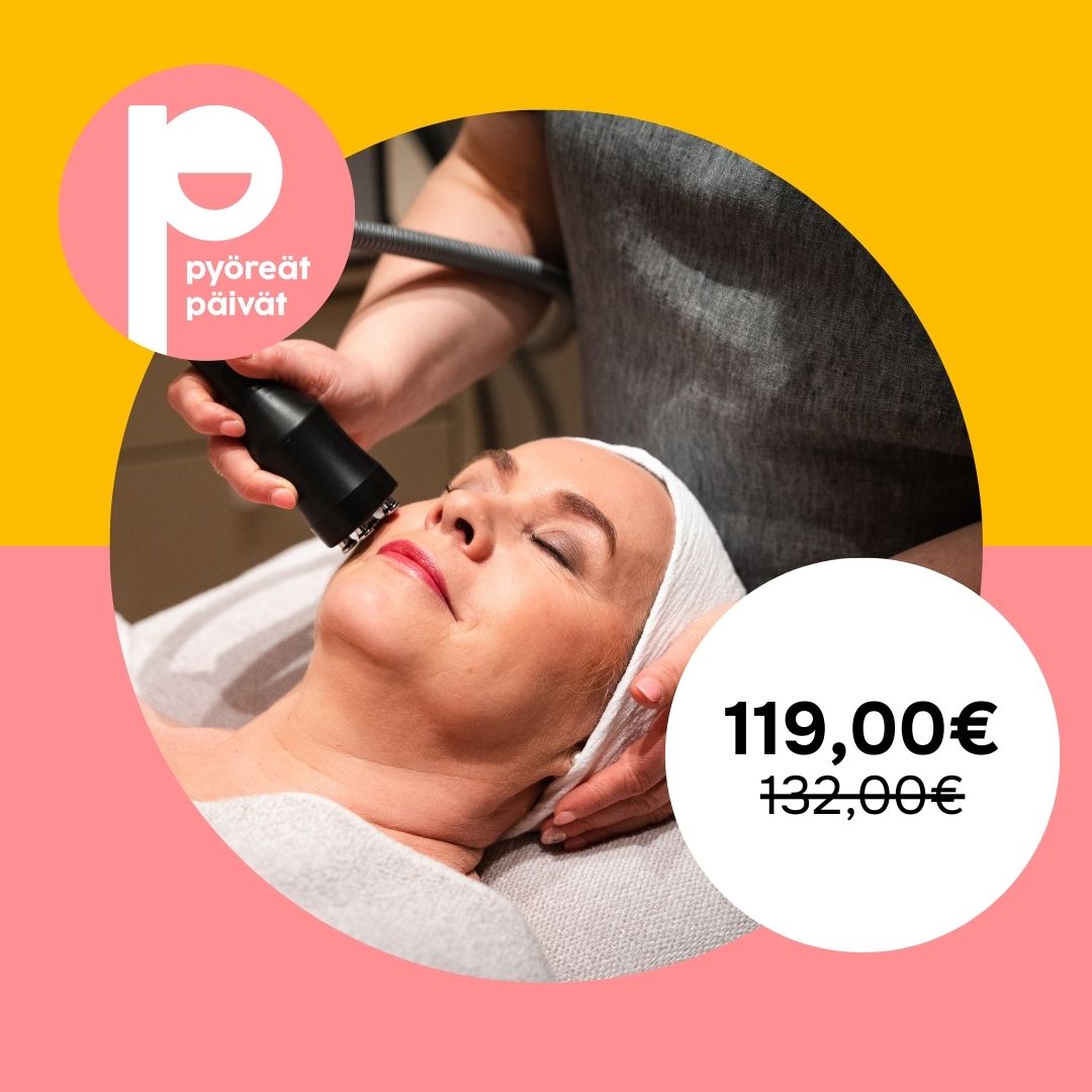 Pyöreät Päivät: RF- kiinteyttävä kasvohoito (radiofrekvenssihoito) on tehokas ja turvallinen tapa kohottaa kasvojen ihoa ilman kirurgisia toimenpiteitä. Caretech RF -laitteen radiotaajuusenergia lämmittää ihon syvempiä kerroksia, mikä aktivoi kollageenin tuotantoa ja silottaa juonteita. Hoito sopii erinomaisesti veltostuneelle kasvojen ja kaulan iholle, silmänympärysalueelle ja kaksoisleuan kiinteyttämiseen.